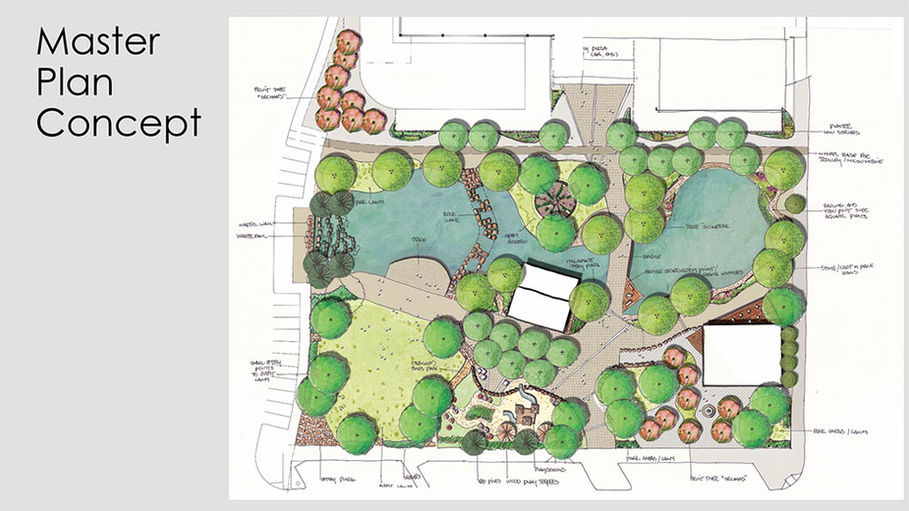 The park features an event amphitheater and lawn, a large playground with both nature based and traditional play areas, a lake framed by bridges and restaurant patios, and a network of plazas and soft and hard surface trails. Additional elements include an educational kiosk, an orchard and entry plaza near the Dillard’s entrance, and a curving pathway system that guides visitors to spaces along the water’s edge as well as quieter, more contemplative areas set back from the lake.